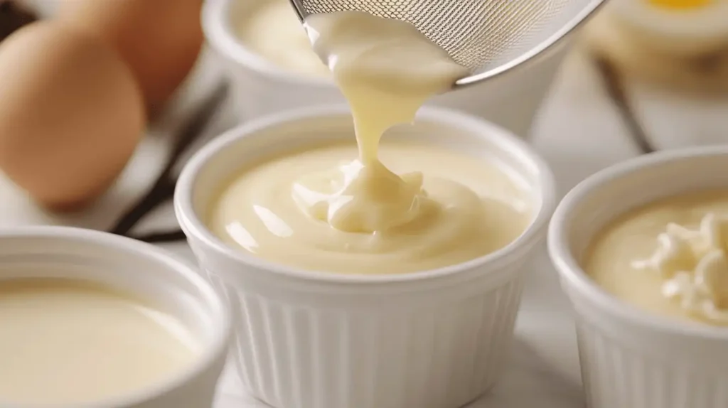 For best results, strain the custard directly into the ramekins to minimize the risk of bubbles reforming.